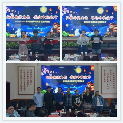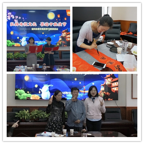 座谈中,青年党员进一步畅谈交流了中秋节的丰富文化内涵和中华各地传统习俗,声情并茂地朗诵了关于中秋的散文诗词,办公室的《水调歌头》、组人部和机关党委的《金秋皓月》、调宣部和计财部的《思乡》、学会部的《春江花月夜》、科普部的《故乡月色》,一首首饱含着思乡之情和美好愿景的美文佳句,浸润着一颗颗年轻又炽热的心灵,青年党员们深深体味了传统文化滋养品行、润物细无声的魅力。在创作中秋节对联环节中,大家翰墨飘香寄情怀,即兴创作了一幅幅朝气蓬勃、砥砺奋进的中秋对联,抒发了对祖国的深深祝福,表达了为科协事业奉献青春的决心和信心。之后,进行了猜中秋灯谜、成语接龙等趣味比赛,大家一起吟唱了苏轼的词《水调歌头·明月几时有》,在欢声笑语中感受了传统文化的乐趣。