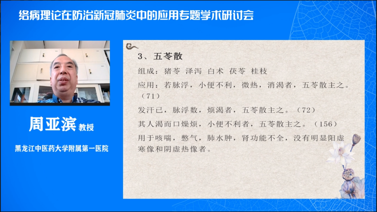 会议邀请到黑龙江省络病学会理事长、黑龙江中医药大学附属第一医院纪委书记周亚滨教授,长春中医药大学基础医学院院长张文风教授,黑龙江中医药大学附属第二医院陈会君教授,河南省中医院韩佳瑞教授,黑龙江中医药大学附属第一医院客蕊教授,黑龙江中医药大学附属第一医院刘影哲教授,黑龙江中医药大学附属第一医院孙静教授,黑龙江中医药大学附属第一医院杨建飞教授等专家学者,分别作了《仲景治疗咳喘大法》、《温病经典方剂解析》、《中医古籍之战疫之道》、《解读中医治疗新冠的方案》、《中医防治新冠肺炎》、《新冠肺炎中医辨治原则及注意事项》、《新冠肺炎出院患者的中医诊治》和《重温瘟疫论-遣方用药浅析》的报告。
